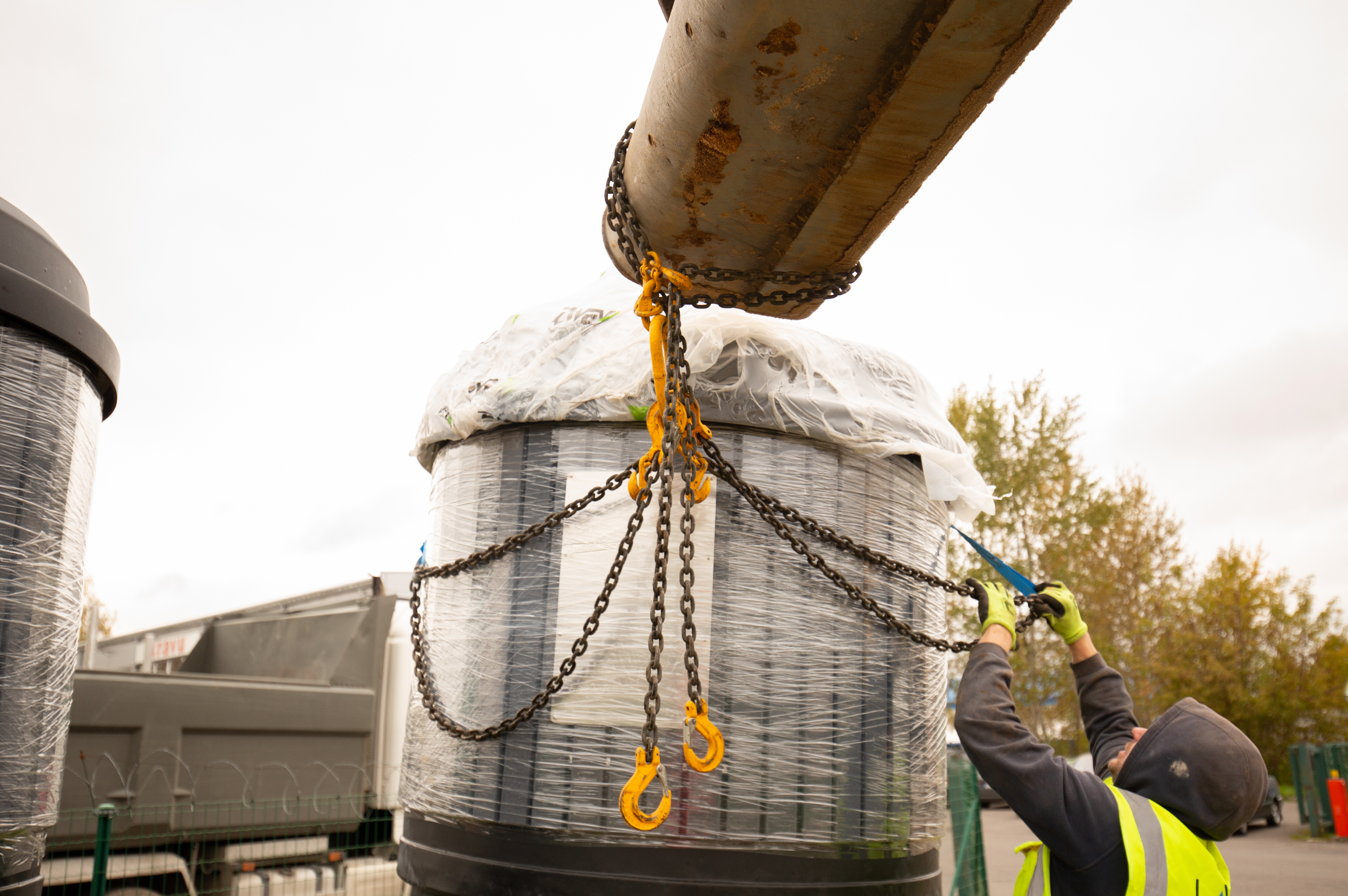 2. Manipulators paceļ iekšējo puspazemes maisu un paceļ to virs atkritumu automašīnas.